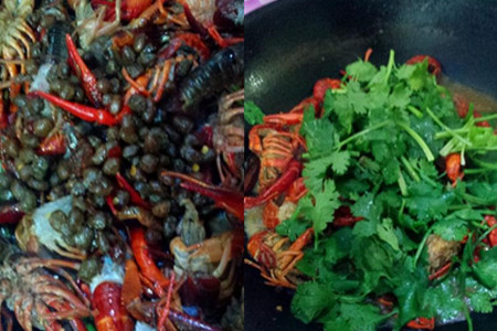小龙虾用刷子清洗干净。青椒洗净切块,香菜洗净切碎。在炒锅里加入适量食用油,烧热,倒入洗干净的小龙虾,翻炒片刻,放入葱姜蒜、大料和花椒,继续翻炒。