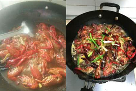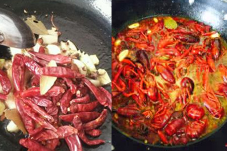 然后,在锅中加入适量的油,油温加热至七八成时。放入蒜末、葱段、姜片进行翻炒爆香。等香味慢慢散发出来后,倒入干辣椒圈和花椒、八角进行均匀地翻炒。翻炒片刻后,放入沥干水分的小龙虾大火爆炒。如果嫌不够辣,可以使用剁椒或者辣椒酱。