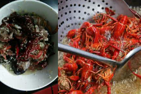 在锅中加入适量的油,油温加热至七八成时。放入腌制好的小龙虾,大火炸上三分钟左右,再用漏勺捞出沥干油。吃的时候,蘸着酱汁食用。
