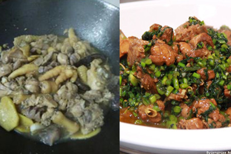 3、在锅中加入少量的熟猪油,油温烧至六七成时,放入山鸡块和肥膘肉翻炒。等到鸡块加热开始变色时,逐一加上料酒、姜片、葱段、生抽,大火烧开,再改为小火慢慢炖煮。