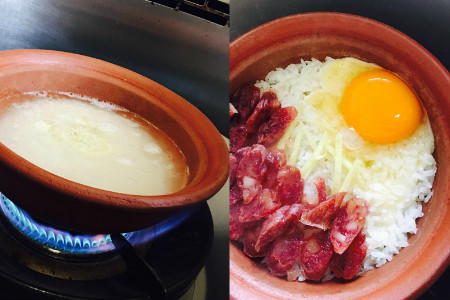 这里就要注意下,水和米的比例大概是一点五比一左右, 这个比例真的非常重要,这关系到饭有没有煮熟。饭煮的太烂不好吃,夹生根本无法下咽。其次再把将米和水倒进沙煲里,再用大火烧开。大概过十分钟不到,饭就开始收水。这里大家明白收水是什么意思吧,接着就可以看到饭的表面有一个个冒着热气的小洞。这个时候就赶紧把肉,姜丝放进去!