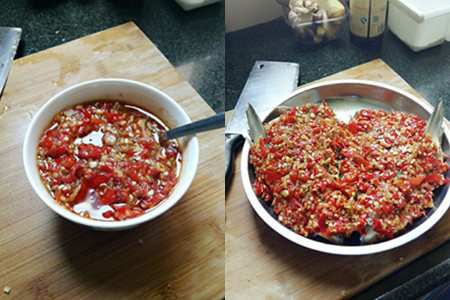 第五步:将腌制好的鱼头放在碟子上,然后将指天椒碎和蒜蓉均匀的铺满在鱼头上面,再往上面洒入淀粉水,食用油均匀的洒在所有的佐料的上面。