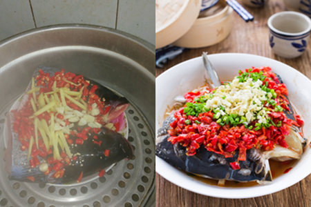 第六步:准备一口干净无油的锅,放入适量的清水,烧开后,放入蒸架,再放入鱼头,盖上锅盖,一直用大火蒸煮十五分钟。