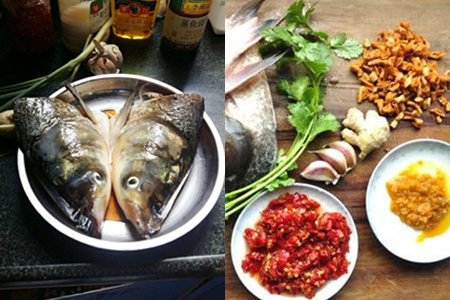 第二步:将鱼头清洗干净,尤其是鱼嘴的部分,用牙刷刷洗。然后,用盘子装好,加入一茶匙的盐,一块拍碎的生姜,切碎的葱段,两茶匙的料酒,搅拌均匀,放置一边,腌制半个小时,待用。
