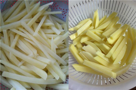 这样做的目的是为了让土豆条在油锅当中可以更好的分离,不会因为淀粉的原因黏在一起。并且用盐水浸泡过的土豆条还更加有利于保存。