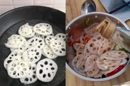 3、把生姜切成碎末状,把干辣椒斜切成片。在煮锅中倒入适量的水,水煮开沸腾冒泡后,把全部的藕片倒入锅中。藕片焯熟后,把藕片用漏勺捞出,放在事先准备好的凉水或者冰水中,这样会使藕片吃起来更加脆爽。浸泡片刻,捞出放入盘子中。