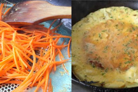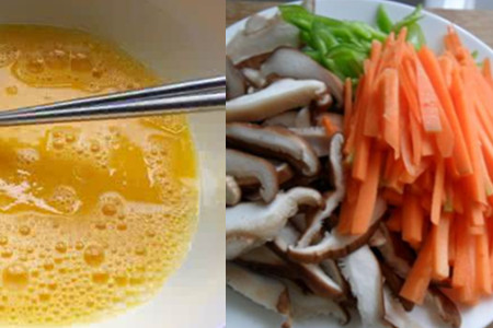 2、将鸡蛋打入碗中,加入盐、胡椒粉,用筷子均匀地搅拌。把胡萝卜、包菜、奶酪、香菇切成细丝,放在一旁备用。