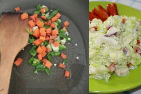3、在锅中加入适量的油,油温加热至七八成后。先将胡萝卜丁放入锅中,这是因为胡萝卜比较难熟。再逐一加入包菜块、青椒丁放入锅中翻炒片刻后,撒上盐、醋、胡椒粉、白糖充分翻炒,使其均匀入味。