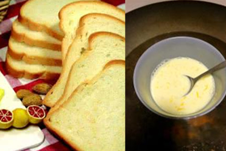 1、将吐司面包切成薄厚适当的片状,尽量保持薄厚的均匀,以免影响吃起来的口感。在牛奶中加入奶酪片,把它放在热水上隔水加热使奶酪溶解在牛奶之中。