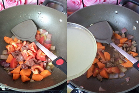 四、热锅将黄油放进去化开,爆香洋葱和大蒜片,依次加入牛肉、胡萝卜和番茄翻炒。