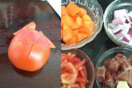 一、食材准备。牛肉一百五十克、胡萝卜一个、洋葱半个、西红柿一个。调味料需要番茄酱两汤勺,食盐、高汤、黄油、香叶和大蒜。