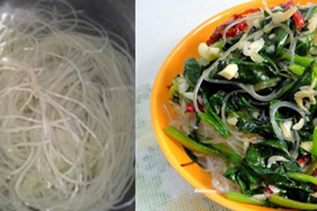 将洗好的菠菜和粉丝分别放进煮沸的水中,焯熟以后捞出来,放在盘子上面。油锅里面倒入少量的食用油,将大蒜和辣椒放进去爆香以后,然后加入适量的盐。