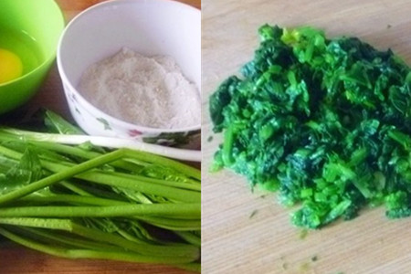 首先需要准备好的材料有:菠菜、鸡蛋、小麦面粉、盐、香葱、香油。买回来的菠菜和香葱都需要先洗干净然后用刀切成比较细小的段状。特别是菠菜越细越好。