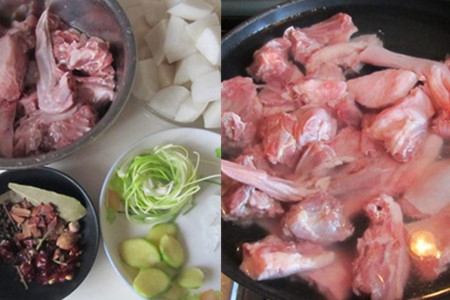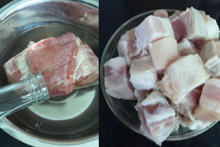 白萝卜削皮切大块待用。将五花肉放入清水中,加入一勺料酒,浸泡十五分钟。十五分钟后,烧一锅开水,下五花肉,烫一两分钟,捞出锅,用凉水冲洗一遍,切成小方块待用。