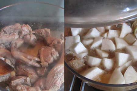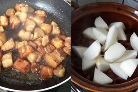 。加入适量开水,转大火煮开,放入八角、葱、姜蒜、干辣椒,转入砂锅中,开小火炖煮。五花肉炖了半小时后,开盖,放入切好的白萝卜块,一起炖,直至白萝卜炖软,汤汁变稠即可。