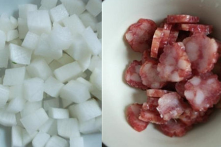 白萝卜削掉外皮,切成小粒。腊肠用温水清洗干净,切成薄片。生姜切碎,蒜苗切小段,干虾仁用清水泡发,滤干水分待用。大米用清水洗干净,倒入电饭煲,加适量清水,按下煮饭键进行煮饭。