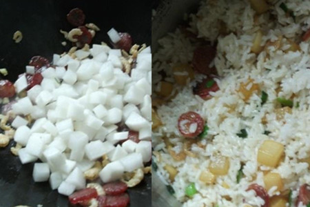 热锅凉油,倒入腊肠片和生姜粒,炒香。加入滤干水分的虾仁,炒香,再倒入切好的萝卜粒,加适量生抽和食盐,翻炒均匀,加盖,中火焖两分钟。两分钟后,撒入切好的蒜苗,炒匀,熄火待用。待米饭跳闸后,开盖,倒入炒好的腊肠萝卜,搅拌均匀,再按煮饭键,跳闸后焖三分钟即可。【女物原创未经允许,谢绝转载!】