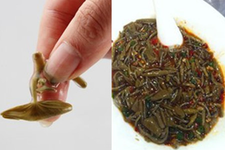 第三步,剔除莼菜中的杂质,这个过程要仔细一点。