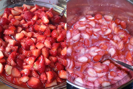 Step 3:草莓进行冷藏后就会析出草莓汁,这时的草莓的状态是偏软的,半液体状的。然后将草莓倒入锅中,先用大火煮沸,然后转中小火慢慢熬煮。这里不需要加水,用原本的草莓汁慢慢熬即可。熬煮过程中一定要不停搅拌,以免草莓酱粘锅煮糊。