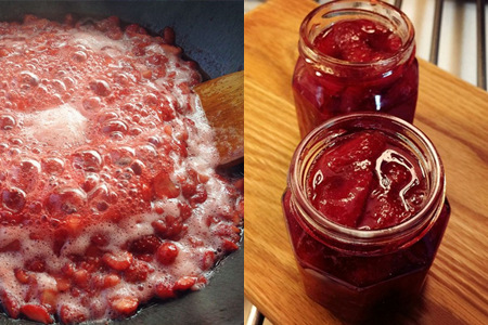 Step 4:在熬煮过程中,如果出现浮末就用网较密的网勺捞起,不断重复这个动作直至果酱变清澈。等到没有浮末时将果肉捞起,继续熬煮酱汁直到酱汁变成粘稠状态。在这其中如果还产生浮末,就重复捞浮末的动作。酱汁变得粘稠之后再将原先捞出的草莓果肉倒回锅中熬煮。