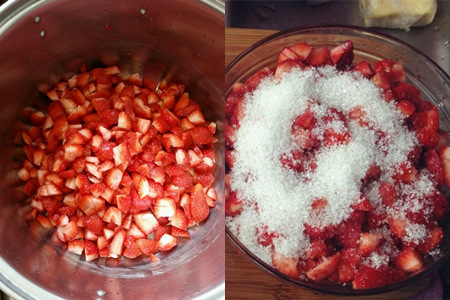 Step 1:首先是准备好精心挑选的草莓。这里草莓的选择没有太大规定,任何大小品种都可以。将草莓清洗干净,去掉草莓蒂,然后切块放进碗里备用。切块的大小随自己喜好,如果喜欢果酱有大的水果粒就切大块,喜欢酱汁更多就切小块。