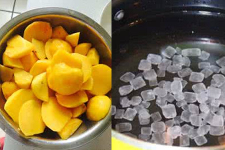 然后,把洗好的黄桃切成大小适当的块状,可以稍微大些但是不能切得过小。在锅中加入适量的水,水开沸腾后放入冰糖,慢慢搅拌直至冰糖完全融化在水中。