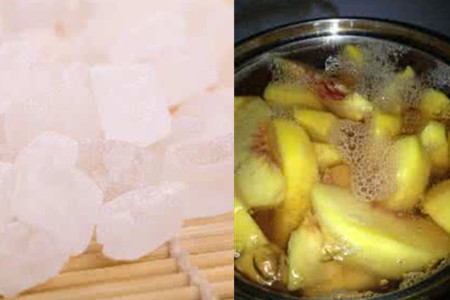 水的量尽量一次性加足,避免反复加水,影响糖水的口感。很多新手第一次制作黄桃罐头,往往冰糖的量难以准确把握。教大家一个小窍门,放冰糖讲究少放多次。
