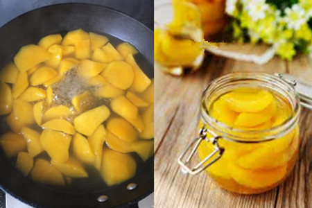 终末,把黄桃块放入糖水中,煮上二十分钟左右。事先准备一个玻璃罐,用开水或者酒精进行消毒杀菌。把制作好的黄桃连带着糖水一同倒入玻璃罐中,不能装满,装到七八成的地方就可以了。盖上盖子,把它倒扣在桌面。等黄桃罐头完全冷却后,把它放在冰箱里或者家里阴凉的地方保存。想要吃的时候,可以随时取出食用。