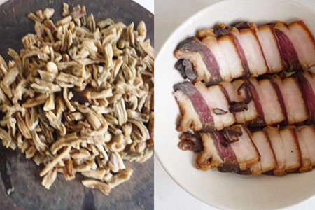 食材:腊肉200克、干豆角200克、鸡毛菜、豆豉、白糖、姜、味精、生抽、料酒、葱。