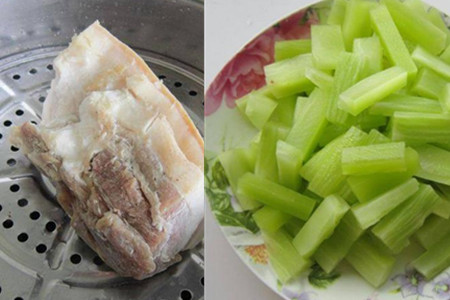 食材:腊肉300克、莴笋1根、干辣椒、大蒜、青辣椒、姜、白糖、鸡精、盐、酱油。