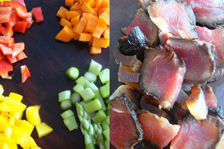 食材:大米400克、腊肉200克、芦笋、彩椒、胡萝卜、虾皮、生抽、橄榄油。