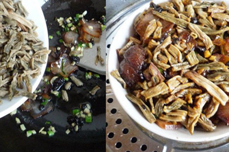 炒好的豆角干盛入码着腊肉的碗中,放入蒸锅,大火烧开后转中小火蒸三十分钟。蒸熟后,把豆角干腊肉扣在盘子上。鸡毛菜清洗干净,用开水烫熟,捞出滤干水分,码在豆角干腊肉周围上即可。
