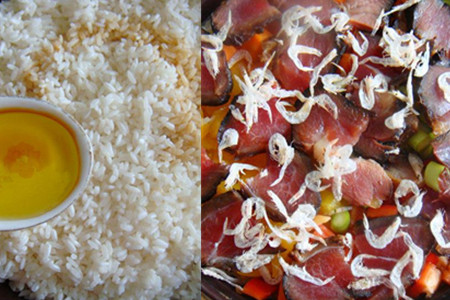 大米泡好后,倒入塔吉锅,加两勺酱油和两勺橄榄油,搅拌均匀,加适量清水,铺上所有的蔬菜丁,再把腊肉片铺在蔬菜上,撒上虾皮,放入微波炉,用微波炉火力先加热五分钟,再加热四分钟,然后加热两分钟即可出炉。