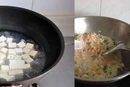 第五步,取一个干净的锅,倒入少许的油烧热并加入切好的大葱和生姜翻炒一会,然后倒入处理好的豆腐翻炒均匀。