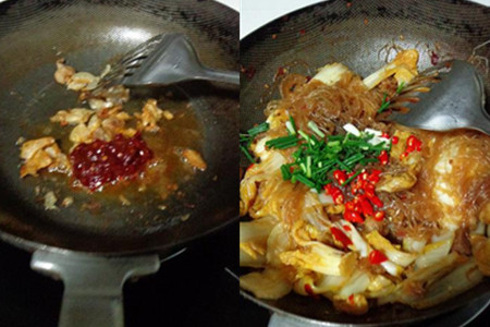 肥肉洗净切片,放入锅里,将肥油炒出来。接着加入豆瓣酱翻炒,把红油炒出,放入娃娃菜翻炒一会,再放入粉丝,加入一大勺蚝油,翻炒均匀。出锅前加入红辣椒和葱花即可。豆瓣酱和蚝油本身就很咸,因此就不需要另外加盐。【女物原创未经允许,谢绝转载!】