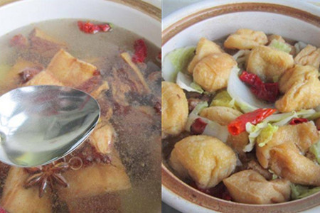 把八角、花椒粒、生姜、干辣椒放入砂锅底,加入腌好的五花肉片,加入适量清水和植物油,开大火煮沸,加盖,转小火炖半小时左右。半小时后,放入娃娃菜、油豆腐、盐,转大火煮开后,转中火煮十分钟左右,调入鸡精搅拌均匀即可。