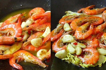 热锅凉油,放入鲜虾炸制,鲜虾炸到变色油亮,倒入调好的酱料,大蒜炸到金黄后,滤掉锅里多余的油。加入准备好的高汤和适量蒸鱼豉油,开大火,把汤汁收得只剩一点,把虾盛出备用。再往锅里加适量食用油,烧热,把娃娃菜整齐地码在锅底,再把煮熟的虾摆在娃娃菜上,小火慢慢把娃娃车煮熟即可。