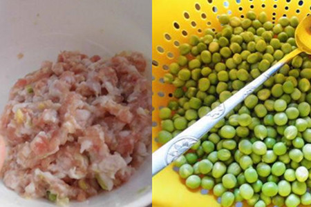 猪肉末加少许姜末和食盐腌渍十分钟。豌豆清洗干净,滤干水分待用。