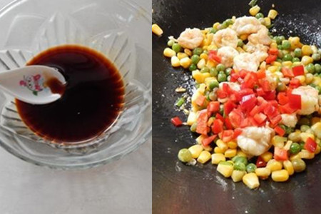 用料酒腌渍虾仁可以去腥。调料汁的时候,由于酱油和蒸鱼豉油都有咸味,因此盐要控制好量,以免太咸。玉米和豌豆都比较难熟,提前用开水烫一下,可以节约炒制时间,而且虾仁也不适合炒太久。