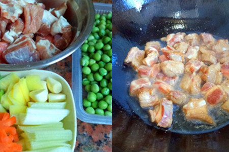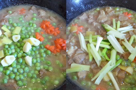 热锅凉油,下腌渍好的排骨,煎香之后,倒入开水没过排骨,大火烧开,转中火加盖焖二十分钟。二十分钟后,开盖,加入蒜瓣、姜片、豌豆和胡萝卜,继续加盖焖十五分钟。十五分钟后,加入适量盐、蚝油、白砂糖,翻炒均匀,然后放入香蒜和香芹,煮熟之后即可出锅。【女物原创未经允许,谢绝转载!】