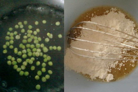 豌豆洗干净,用开水烫一下,捞出锅待用。鸡蛋打散,加适量食盐、十三香,放入小麦面粉,搅拌均匀。