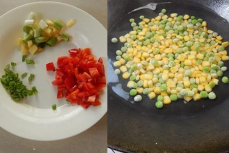 红椒洗净切丁,小葱切碎,姜切碎。虾仁用少许料酒腌渍十分钟。取一口锅,加适量清水,大火煮沸,下豌豆和玉米粒烫一下,捞出锅待用。