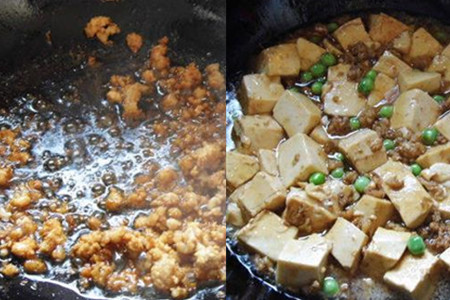 热锅凉油,下猪肉末煸炒,炒至猪肉变白色,加一勺生抽,炒匀。放入洗好的豌豆和豆腐块,加适量胡椒粉和一勺生抽,煸炒片刻。再倒入适量清水,加盖焖五分钟。五分钟后,开盖,淋入水淀粉,搅拌均匀,汤汁变浓稠即可出锅。水淀粉要等到收汁的时候才放入,豆腐要焖一会才能更好入味。猪肉馅下锅后要炒散开来。