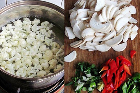花菜手撕成小块,用水洗干净,用开水烫一分钟,捞出锅滤干水分。杏鲍菇洗净切成片,青红椒洗干净切成小片。