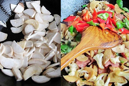 食材:杏鲍菇500克、花菜100克、培根4片、葱、姜、蒜瓣、青椒、红椒、酱油、料酒、香油、白砂糖、鸡精、香醋、盐、油。