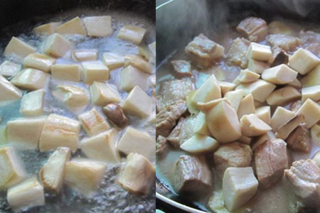 烧热炒锅,下生姜片和杏鲍菇翻炒。杏鲍菇炒软之后,加适量清水,煮开,把杏鲍菇捞出锅滤干水分。往锅里加少许油,烧热,下腌好的猪肉翻炒,猪肉炒变色并且出油后,倒入适量清水,放几块冰糖,加盖焖煮,大火烧开后转小火。