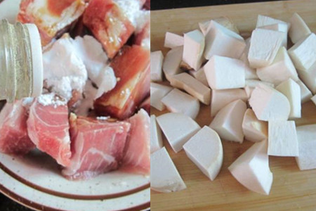 食材:杏鲍菇200克、猪肉350克、姜、盐、蚝油、油。猪肉洗干净切厚方块,生姜切片。