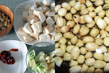 花生用热水浸泡十分钟。杏鲍菇洗干净切大丁,葱姜蒜洗干净切片,花生泡好后去掉红衣,干辣椒洗净切段待用。在锅里放多一些的油,放入花生炸制,把花生炸熟后捞出控油。
