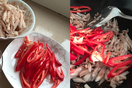 第二步,把准备好的辣椒拿出来用清水清洗干净,去掉梗以及里面的籽之后用刀把它切成条状。接着把莲藕拿出来用工具把它的外皮给削掉,然后冲洗几遍并切成条状。