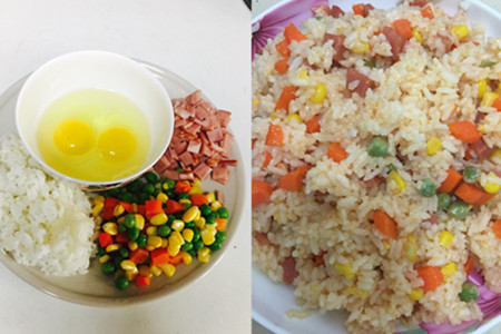 配料:鸡蛋2颗、隔夜米饭200克、玉米粒少许、胡萝卜少许、瘦肉少许、豌豆、青椒1个、盐、食用油、淀粉、番茄酱。